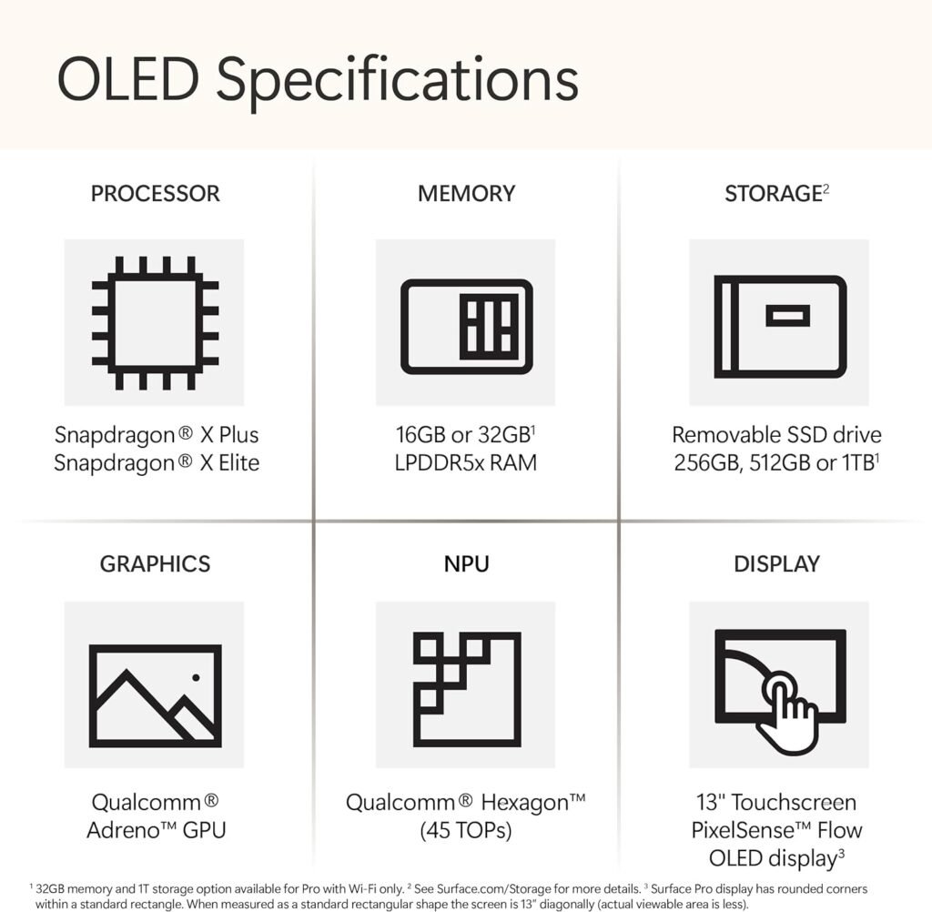 The highlight of the Microsoft Surface Pro hybrid laptoptablet (2024) is its 13-inch touchscreen OLED display. This sleek display offers vibrant colors and crisp text, making it ideal for watching movies, photo editing or any demanding task. Power of Snapdragon X Elite (12 cores). Microsoft Surface Pro Hybrid Laptop/Tablet (2024) is powered by Snapdragon X Elite (12 Core) processor. This powerful processor ensures a smooth workflow, whether you’re multitasking, playing videos or playing games.